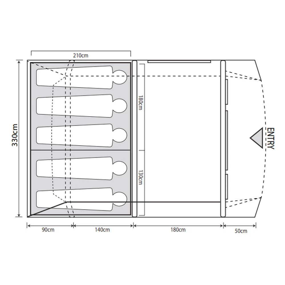 An excellent value five berth tunnel tent ideal as a weekender tent for small families. It is unrivalled in terms of functionality, flexibility, and innovation at this price point. The internal design offers the perfect allocation of usable space for touring families, split between a generous commune area, and a darkened ‘Twilight’ fabric five-person bedroom that can be split down to a 2/3 configuration using the toggle in divider. Ventilation across the rear of the bedrooms, a front mesh ventilation fly screen panel and crystal-clear window panels maintain an airy internal space and maximise airflow in warmer temperatures. An integral front canopy provides an ideal area for alfresco relaxation, cooking, and grants protection against the elements. Outdoor Revolution understand that comfort has become a prerequisite for the modernized camper, which is why this tent comes complete with Dura-tread Carpet and a Footprint Groundsheet, adding to the already outstanding value of this family tent. • 120HDE high density all weather lightweight fabric