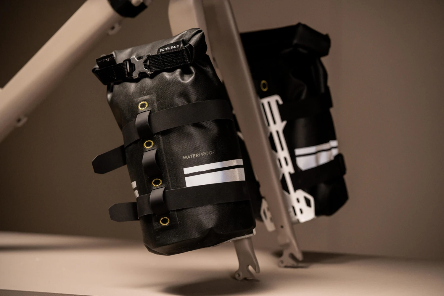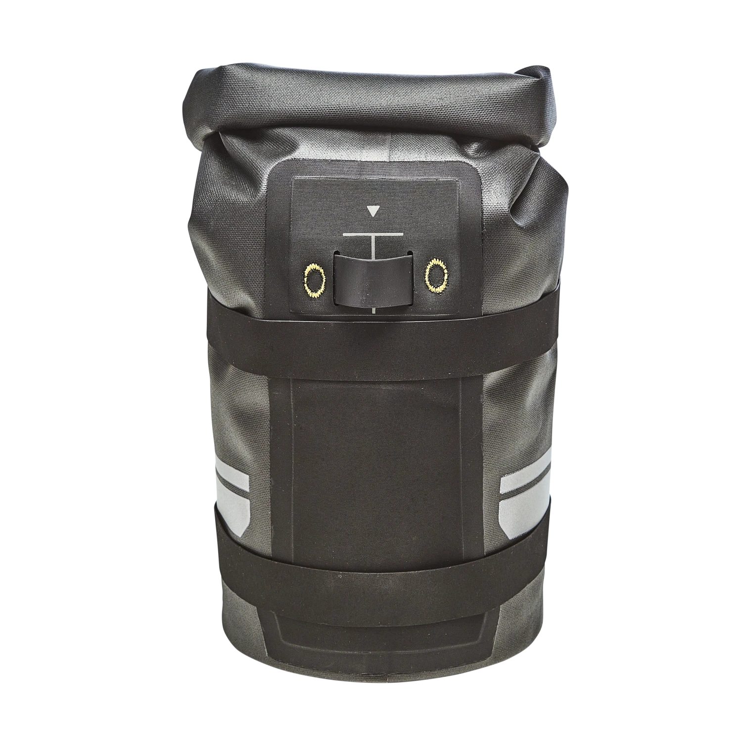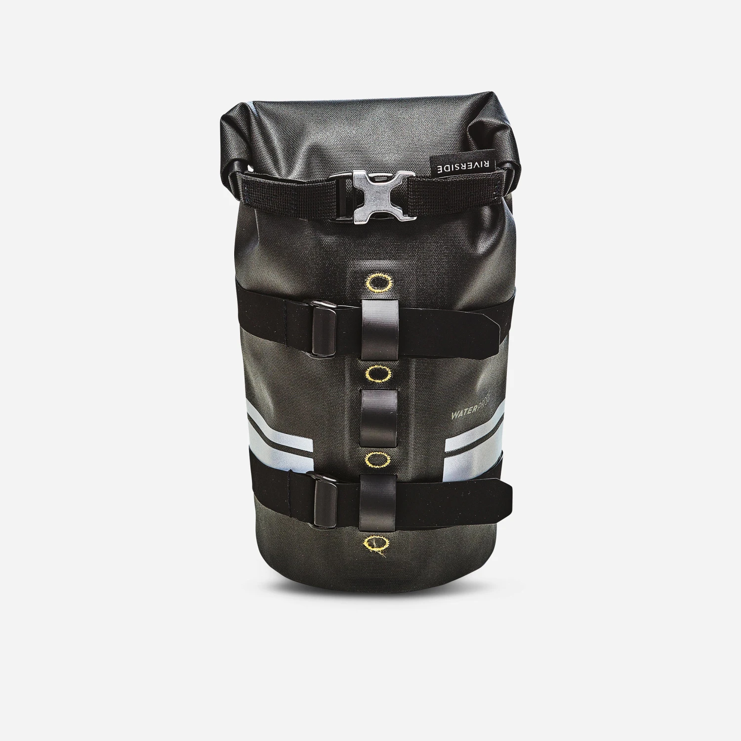 Our team of bikepackers has designed this fork bag to keep your belongings dry when carrying them on a cargo cage during bikepacking rides.This bag is highly durable thanks to the hypalon sections and is extremely waterproof (IPX6). There are 2 hypalon straps and an exclusive strap loop at the back to hold everything securely in place