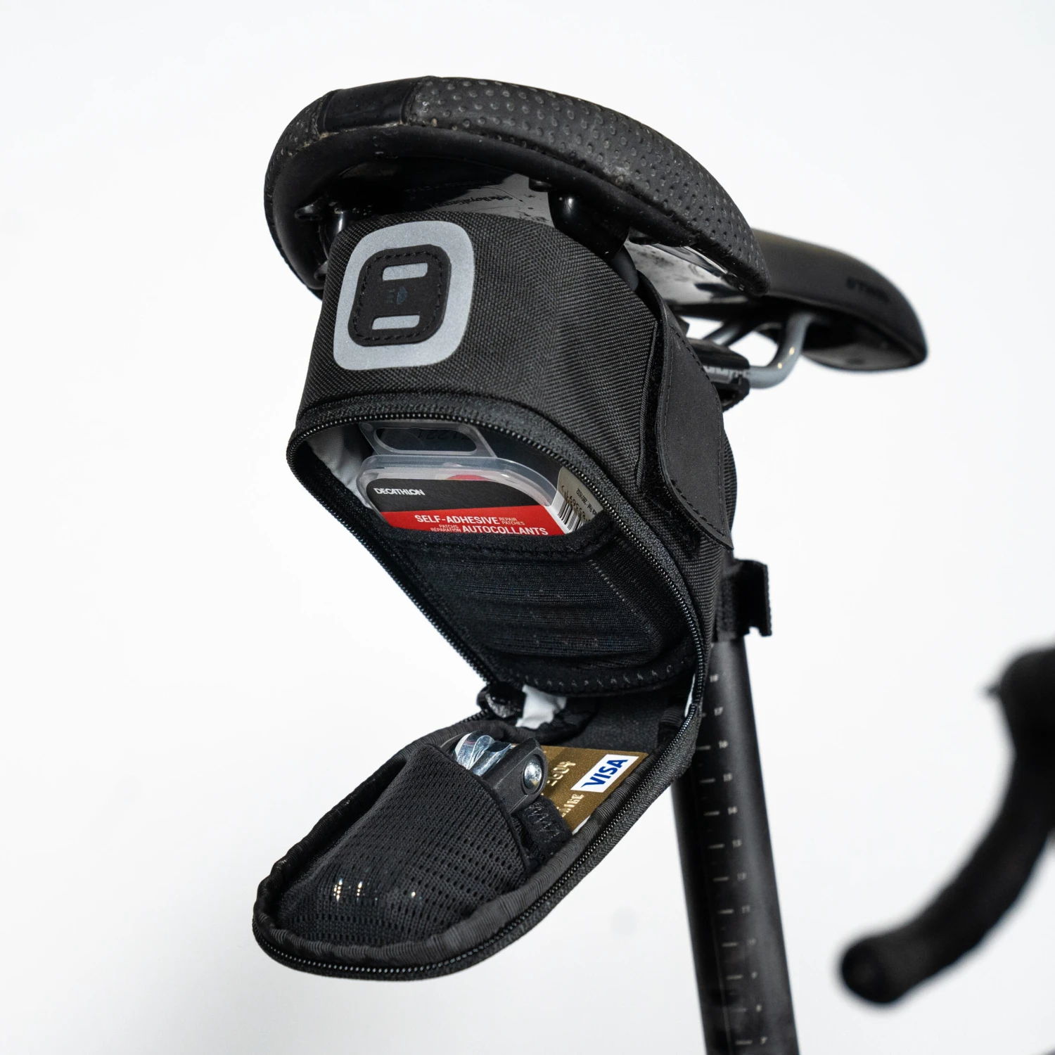 Designed for carrying the essentials needed to perform bike repairs and a few small personal items.Kit which includes saddle bag + multitool + 3 tyre levers.Semi-rigid 0.6 L bag that’s easy to put on any kind of bike saddle and provides easy access to your belongings.