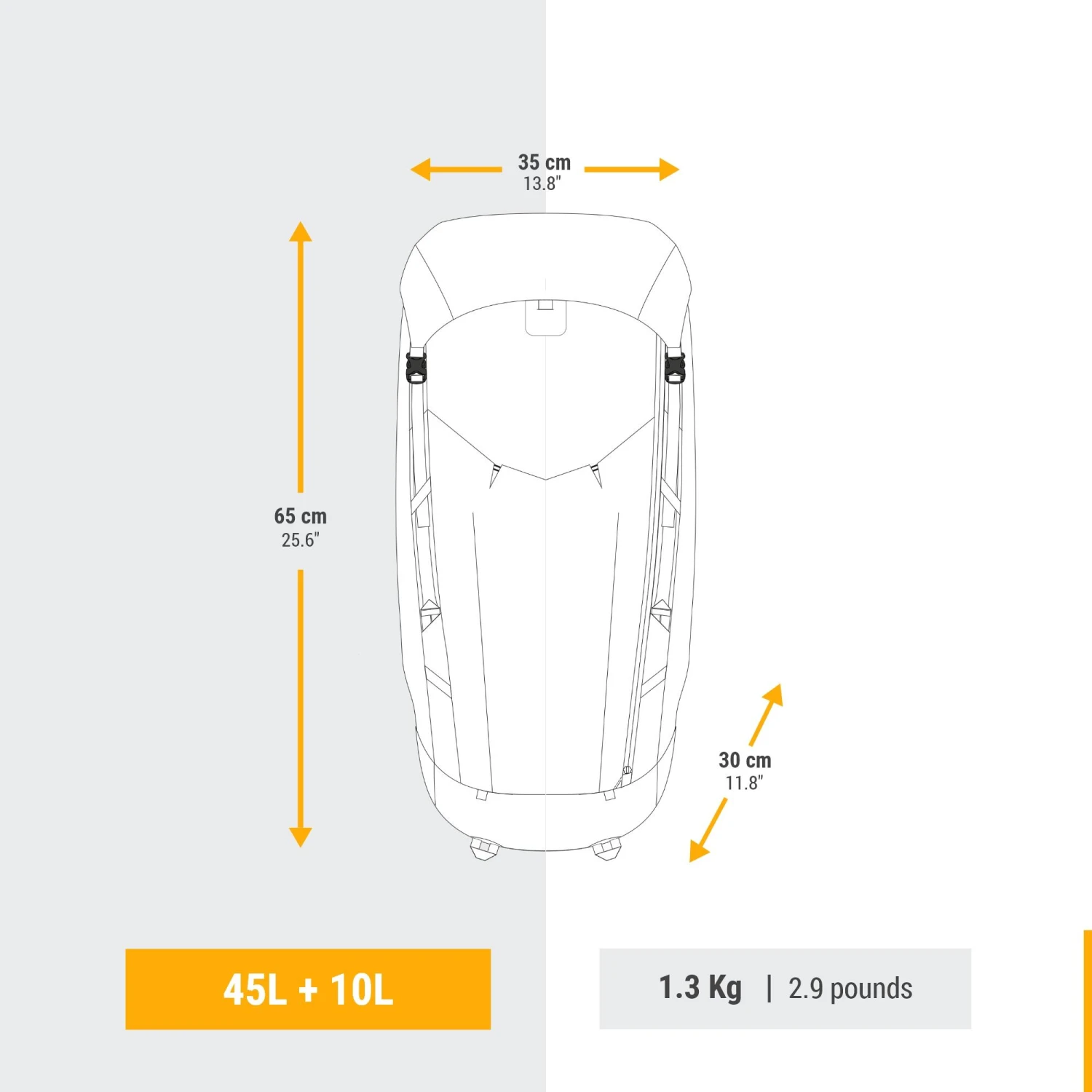 Volume of 45L with a +10L extension. The volume of each backpack is measured using a standardised method. we use small balls to fill the main compartment as well as each pocket. The balls are then emptied into a graduated container in order to determine the equivalent volume in litres, with a margin of error of just a few %.